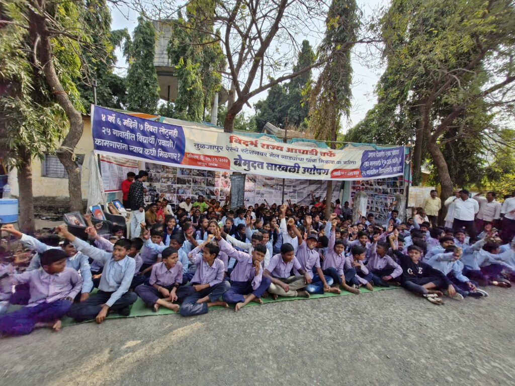 वर्ध्याच्या सेलू तालुक्यात येणाऱ्या तुळजापूर (दहेगाव) येथे जलद गाड्यांना थांबा मिळावा यासाठी नागरिक विदर्भ राज्य आघाडीच्या नेतृत्वात साखळी उपोषणाला बसले आहे. शिक्षणासाठी दहेगाव येथून बाहेरगावी जाणाऱ्या विद्यार्थ्यांसाठी रेल्वे थांबा अत्यावश्यक असल्याने शाळकरी विद्यार्थी देखील मोठ्या संख्येत या आंदोलनात सहभागी झाले आहे. 27 जानेवारी पासून हे उपोषण सुरू असून शाळकरी विद्यार्थ्यांनी मोठ्या संख्येत या आंदोलनात सहभागी होऊन आपल्या मागणीकडे सर्वांचे लक्ष वेधले आहे.